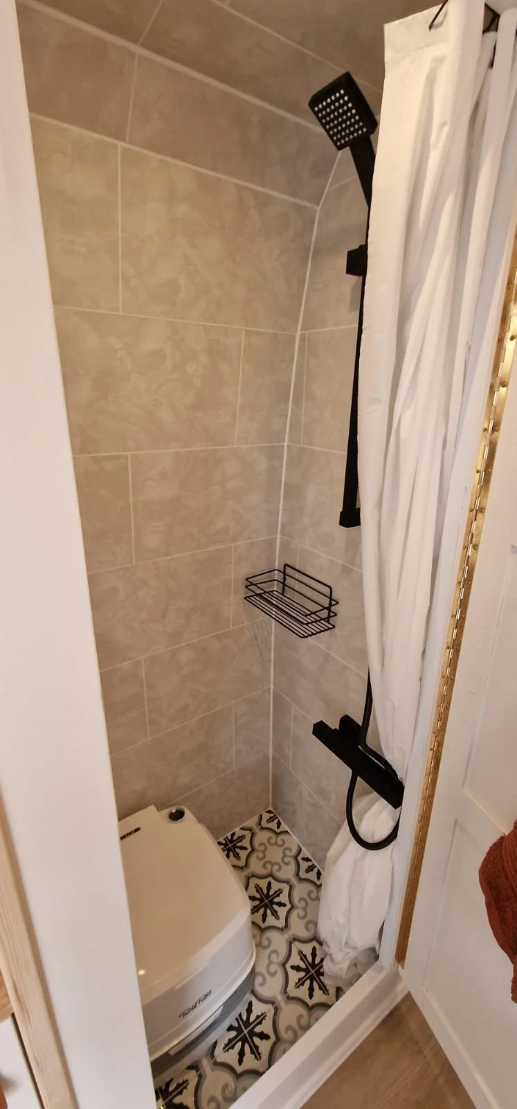 Black shower head with cold water – perfect for washing out muddy boots or pet paws.
